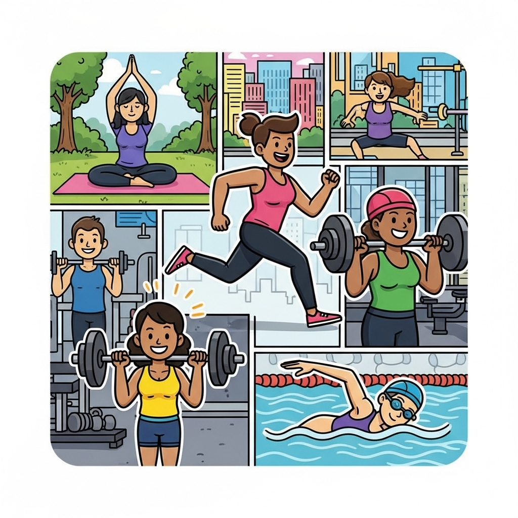 유산소 운동: 걷기, 조깅, 수영, 자전거, 등산, 댄스 등. 근력 운동: 맨몸 운동(푸시업, 스쿼트), 웨이트 트레이닝, 필라테스 등. 유연성 및 균형 운동: 요가, 스트레칭 등. 단체 운동: 축구, 농구, 배드민턴 등. 몇 가지 운동을 2주~1개월 정도 꾸준히 경험해 보고 자신에게 가장 재미있고 부담 없는 운동을 찾아보세요.